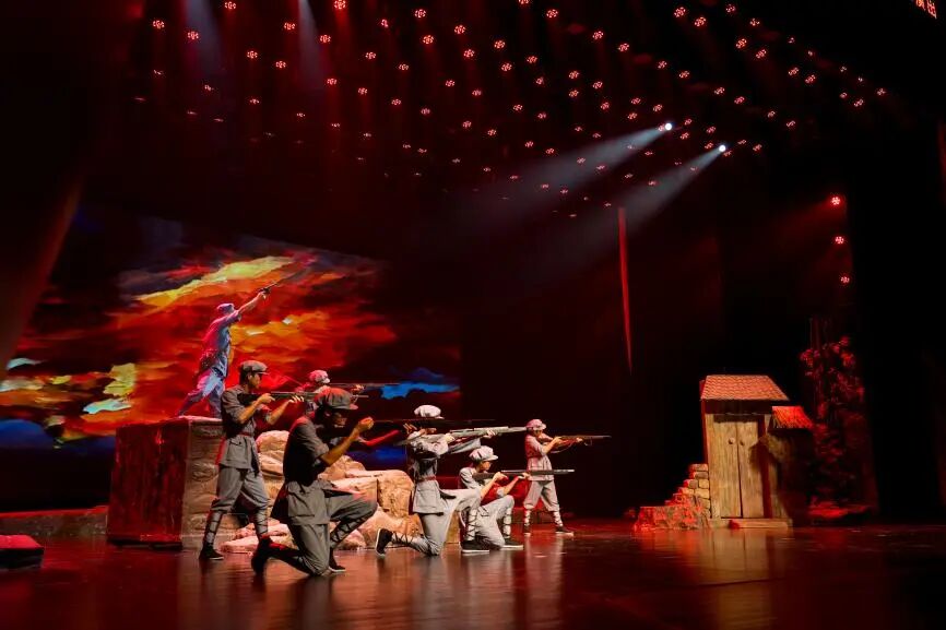 演出现场,演员们用含泪的眼眸、真挚的唱腔,将伟大母亲送儿出征的家国情怀演绎得动人心弦,让红色记忆在双节氛围里更添厚重。剧目运用简洁而寓意深刻的舞美、灯光设计,让观众穿越时空,重返新田百石,回顾历史上那风云跌宕、燃魂动情红军长征第一仗,倾听历史的回响,追寻红色的记忆。